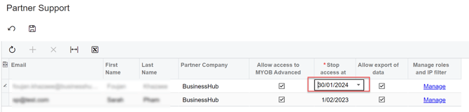 For security purposes, we recommend that you set a date for the Partner Support access to expire, for example the date that the work or support is expected to be completed, or that you use the Partner Support screen to manage/cease BusinessHub's access after the work has been completed.